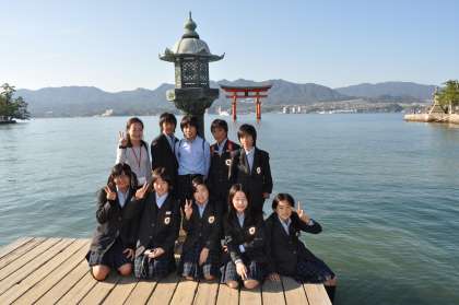 1日目,宮島学園の9年生に宮島の案内をしてもらった後,厳島神社を見学しました。海の中に浮かぶ神社を見て子どもたちは,幻想的な雰囲気になったようでした。反対に,大鳥居のところまで行ってみたかったという子どももいました。