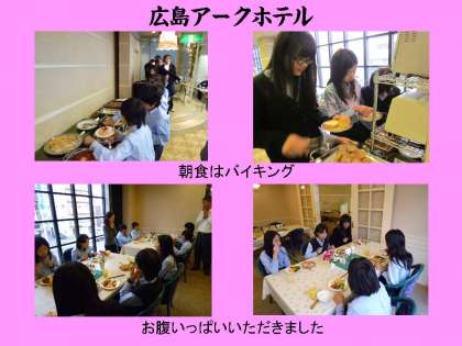 2日目,さわやかな朝をむかえました。みんなぐっすり眠ることができ,体調も万全です。7時起床。7時30分より,朝食。ホテルのレストランでバイキング。洋食(パン)も和食(ごはん)もあり,ジュースも飲み放題。子どもたちもお腹いっぱいいただきました。
