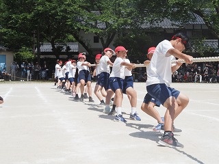 9年生を先頭に 力いっぱい綱を引いています。