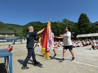 校長先生から 各組の応援団長に,応援賞が贈られました。