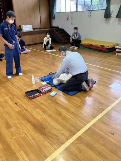 6月17日(金),本校の教職員を対象とした救命救急研修を行いました。左京消防署より3名の救急隊員にお越しいただき,一次救命措置として心肺蘇生法やAEDの使い方について学びました。