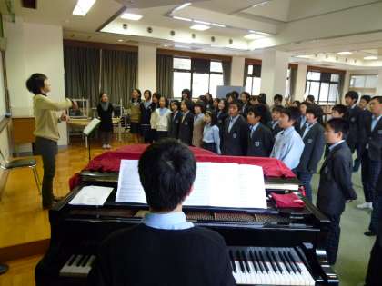 11月14日(月)4校時に,中後期ブロックの合同音楽を多目的室で行いました。22日(火)の研究発表会で披露する歌の練習です。