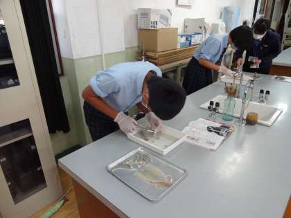 理科室で、イカを解剖しています。