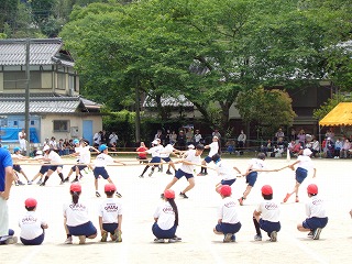 中期ブロックの「一文字綱引き」は、綱を両側から引っ張り、自分の色の陣地に引寄せて旗を取ったら勝ちです。白熱しました。