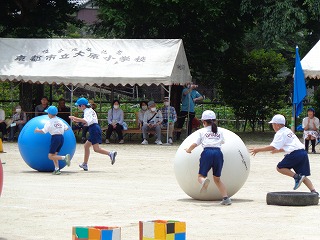前期ブロックの「大玉小玉でハイタッチ」は二人で力を合わせて大玉を転がします。ハイタッチも息ぴったりでした。