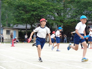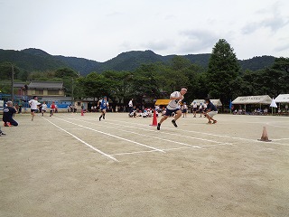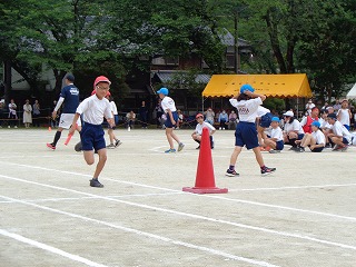 「色別対抗リレー」は、1年生が第一走者となり9年生生までバトンを繋ぎました。可愛らしい走りから、力強い走りになり迫力満点でゴールします。三色とも力いっぱい走りました。