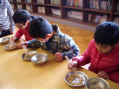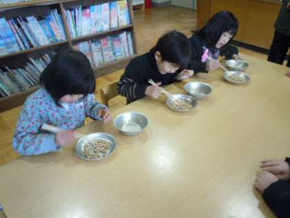 1月27日(金)給食週間5日目。中間休みに前期ブロックの豆つまみ大会を行いました。30秒間に大豆を何個うつせるかを競いました。前期ブロックの子どもたちも苦労しながら,うつしていました。箸の持ち方が正しい子どもがたくさんうつすことができたようです。みんな真剣に取り組んでいました。