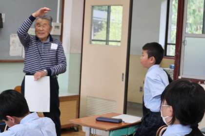 地域の佐竹さんを招いて、お米作りの手順や歴史などを学習しました。