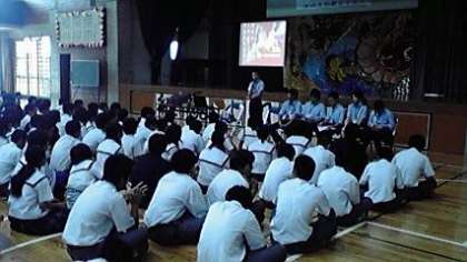 石嶺中学校へ到着しました。挨拶の後,京都や大原、大原学院の紹介をしています。