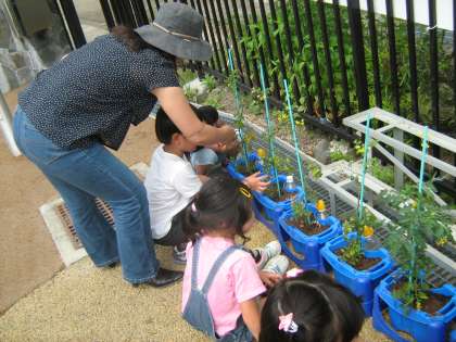 2年生は生活科の学習でミニトマトを育てています。一人一人がプランターに苗を植え,成長の様子を観察しています。花が咲き,実が熟してきているものもあります。収穫を楽しみにしながら水やりをしています。