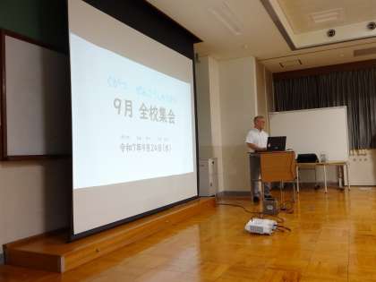 本館多目的室の窓を開放して、本日、9月の集会を行いました。