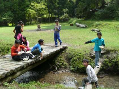 炊事場の近くには小川が流れ,芝生の広場もあり食べ終わった児童はさっそく遊んでいました。