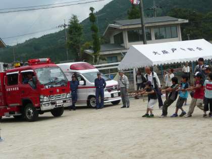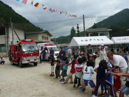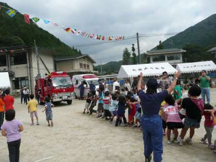 「消防車」のプログラムでは,子どもたちが力を合わせて消防車を引っ張りました。