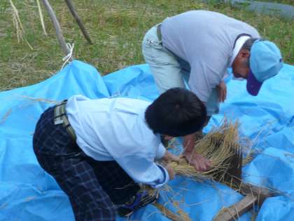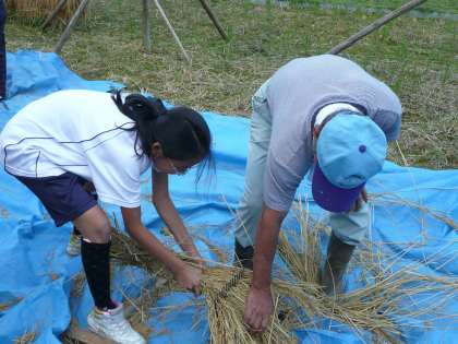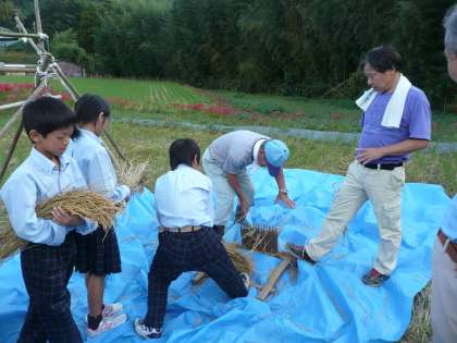 今日の5校時に学校の田んぼで5年生・6年生が脱穀をしました。千羽こきを使った脱穀では,なかなか穂がとれず何度も繰り返しチャレンジする子もいました。