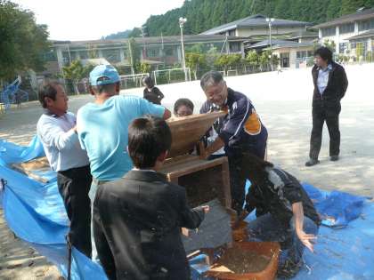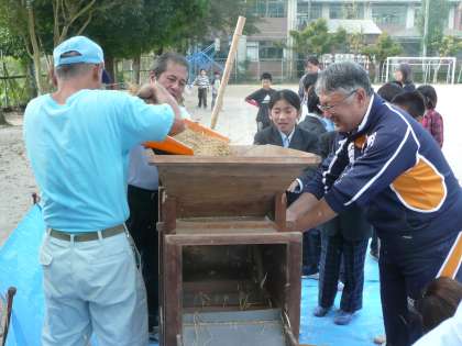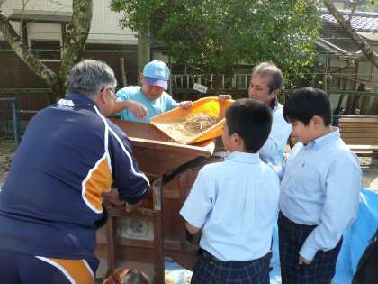 今日の午前中に運動場でとうみをつかってもみ殻とわらくずを分別しました。子どもたちは木のハンドルのようなものを回転させました。動かす速さを加減するのが難しいのですが,慣れてリズムをつかむと上手にできました。