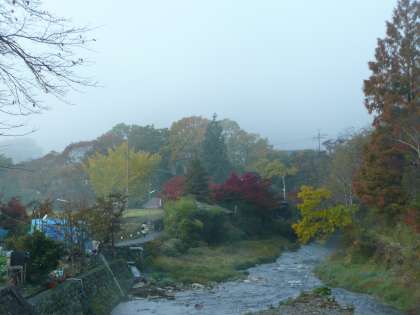 秋が深まり,大原の紅葉は今が一番美しく見頃になってきました。今朝の大原は霧に覆われ,その隙間から朝日が差し込んでいました。学校と大原バス停の間の和田橋のたもとにある温度計は1度の表示をしていました。