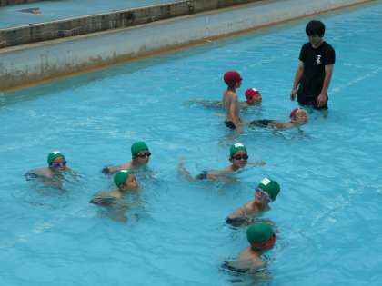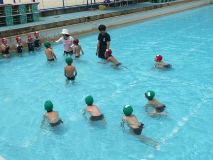 今日から1、2年生の水遊びがスタートしました。はじめにプールでの約束ごとを確認したあと,今シーズン初めてプールに入りました。3年生以上の水泳学習は来週から始まります。
