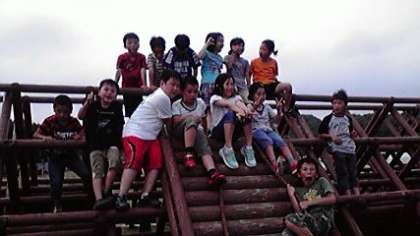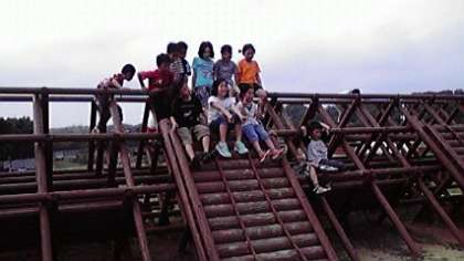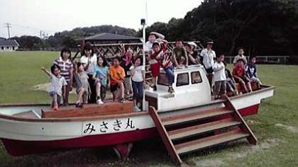 みさきの家に着いてからは,所内オリエンテーリングをしたり,芝生広場で遊んだりしました。写真は芝生広場にある遊具や船で撮ったものです。みんな元気です。このあと,入浴,夕食,キャンプファイヤーと続いていきます。