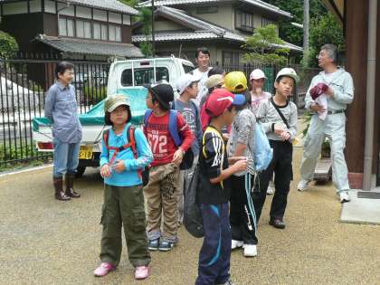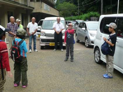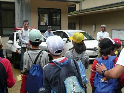 今日は天候不順のため,百井までの歩きのコースを小出石経由の道に変更しました。出発前に準備運動をしました。
