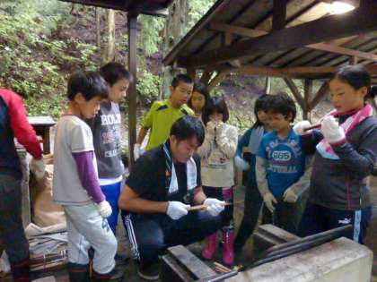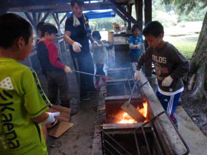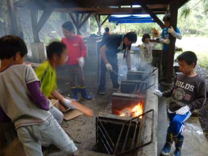 火をおこし,杉の板を焼きました。焼いた板はみがいた後,絵を描いて思い出の作品づくりをします。