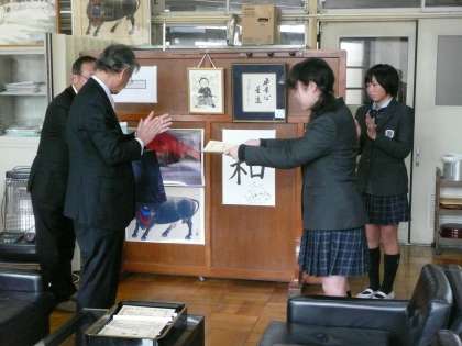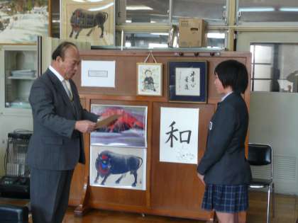 今日の午後,左京税務署の方が来られ税の作文表彰式がありました。9年生の生徒が表彰されました。