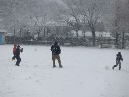 朝から降り始めた雪がどんどん積もっています。写真は,中間休みに雪遊びをする子どもたちの様子です。