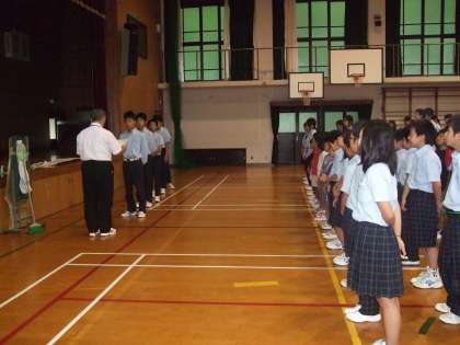平成26年7月7日(月)の1限、体育館において、7月の朝会・ふれあいタイムを行いました。朝会では、最初に伝達表彰を行いました。1つ目は、「第40回合同球技大会」において、種目ドッジボールAで見事に第1位になった、8年1組の生徒に校長先生から表彰状が手渡されました。2つ目は、「第51回 紫野カップソフトテニス大会(男子の部)」において、見事に第3位に入賞した男子ソフトテニス部員に、校長先生から表彰状が手渡されました。