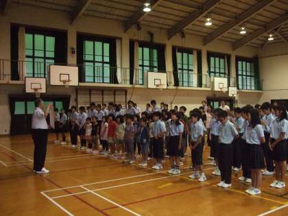 2つ目は、「子どもは、最も笑顔が素敵な存在です。人生には、他人と心のすれ違いが生じることもあれば、自分自身のことでも思うに任せない時もあるでしょう。そんな時にこそ、笑顔が大切です。微笑んで前向きに生きることで明日へ挑戦する勇気を得ることができます。みなさんも大笑いをしてみましょう。」実際に全校の児童生徒で大笑いをしました。