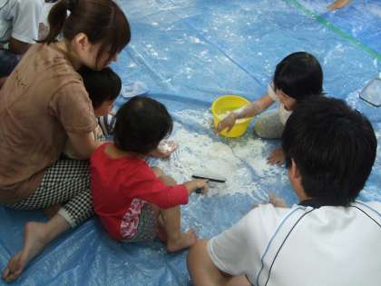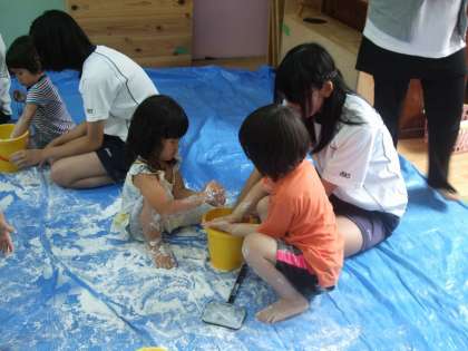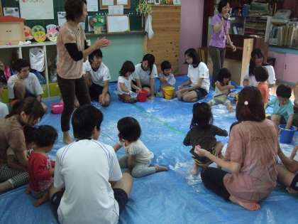 平成26年7月8日(火)3限に、9年生が家庭科の学習の一環として、「京ベビーハウス小野山わらんべ」を訪問し、幼児とふれ合いました。本時の目標は、「感触遊び(スライム作り)を行って、幼児の反応を観察しよう。」でした。「子どものテンションはたかいなあ。」「おとなしい子どももいるなあ。」「最初はおとなしかったけれど、慣れてきたら、だんだんはしゃぐようになってきたなあ。」など、幼児の反応を見て、工夫して係わっていました。ふれあい活動終了後、9年生の教室に戻ってまとめを行いました。
