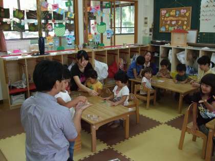 平成26年9月9日(火)の2限,本校の理科教諭が,昼間里親「小野山わらんべ」の園児たちに,オオムラサキの幼虫について話をしました。その後,シャーレに入った幼虫を園児たちは手に取りながら観察していました。最後に「何か質問はありませんか?」という問いに対して,園児の一人が「幼虫は,なぜ緑色をしているのですか。」と尋ねました。先生は「良い質問ですね」と言って,「食べ物のエノキの葉に似せて,外的から身を守るためです。冬には葉が枯れて落ちるので,幼虫も茶色になります。そして,新緑の春にもう一度緑になります。」と答えていました。園児たちは。興味津々に聞いていました。