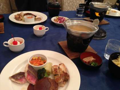 ロワジールホテル沖縄美ら海に着き、みんなで食事をしています。