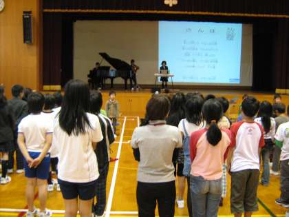 1年生の紹介に引き続いて,『さんぽ』の全員合唱を行いました。