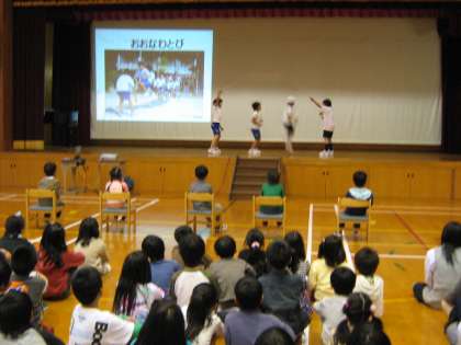 全員合唱に引き続いて,5年生が学校紹介をしてくれました。5年生が1年間の紹介をしてくれました。「えんそく・おおなわとび・プール・うんどうかい」などを寸劇で紹介してくれました。とても楽しい紹介でした。
