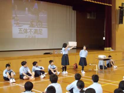 続いての「ふれあいタイム」では5年生の発表がありました。5年生からは乙武洋匡さんの本「五体不満足」についての紹介がありました。学院生のみんなにクイズ形式で乙武さんのことについての紹介がありました。最後は5年生1人ずつが大きな声で本の感想を述べてくれました。