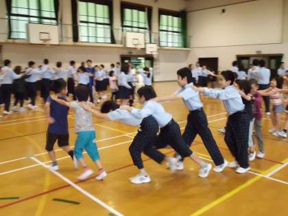 6月9日(火)、今年度初のエンジョイニコニコタイムがありました。今日のテーマは「機関車じゃんけんゲーム」じゃんけんをして勝った人が先頭になり、次々に長い列をつくっていくゲームです。1回戦では、N先生と7年生の決勝対決があり、見事7年生が勝利。N先生は非常に悔しがっていました。2回戦は2年生が勝利し、1年生から9年生までみんなが楽しめた時間になりました。企画、進行してくれた学院生ありがとうございました。