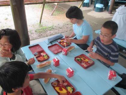 今朝の朝食の様子です。東屋でいただきました。みんなしっかり食べました。