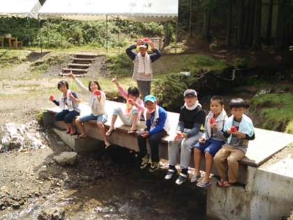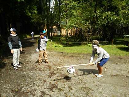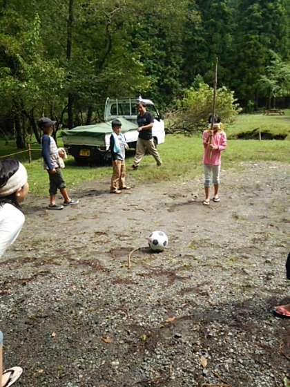 食後のスイカをいただいています。本当はスイカ割りをしていただくのですが、スイカはもったいないので、サッカーボール割りです。見事命中させたので、おいしく頂きました!