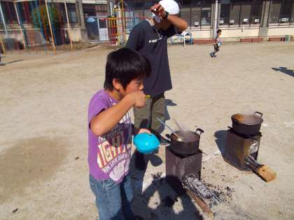 メニューは、ビーフシチュー、豚汁、カレー、クリームシチューなど様々。学院生は縦割り活動の中、かまど係り、ごはん係り、食材を切る係りとてきぱきと動いていました。