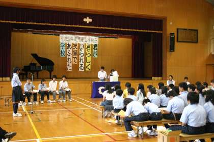 6月16日(水)午後に,体育館において,児童生徒総会を行いました。児童生徒会テーマ『君が君らしくいられる笑顔であふれた学校』の横断幕のもと,4年生から9年生が学校生活について話し合いました。児童生徒会本部や各専門員会からの議案をもとに,みんなで真剣に審議しました。後半には,各学級がそれぞれ趣向を凝らした学級紹介を行いました。最後に,児童生徒会本部から,『児童生徒会歌』のお披露目がありました。この歌は,本部の人たちが作詞作曲した歌です。また歌う機会があると思います。