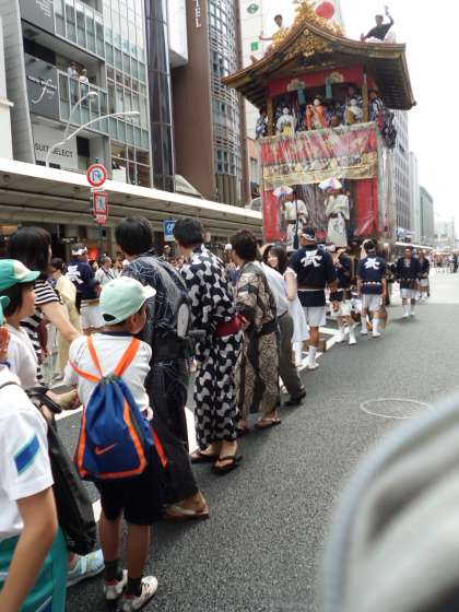 午後は,雨が上がり,四条通で行われる長刀鉾の曳き初めに参加しました。大変大勢の中で,洛央小学校の6年生と一緒に,一生懸命に鉾を曳きました。