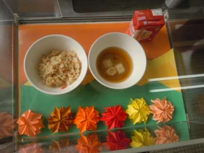 台風に備えて学校で保管しておいた缶詰・乾物を使って作りました。