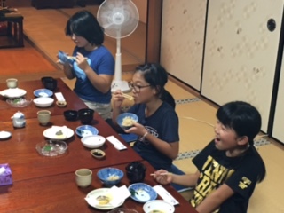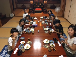 夕食は、野菜を中心とした精進料理でした。みんなで美味しくいただきました。誰一人残すことなく、完食しました。食べた後は、後片付けもしっかりしました。このあと入浴です。