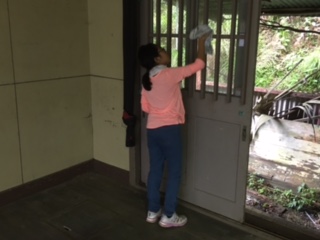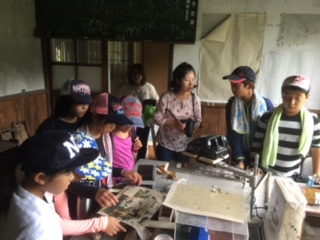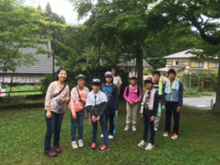 百井分校に到着しました。天気は曇りです。みんなで校舎の中を見学しました。当時の写真などが印象的でした。見学のあとは掃除をしました。