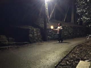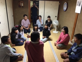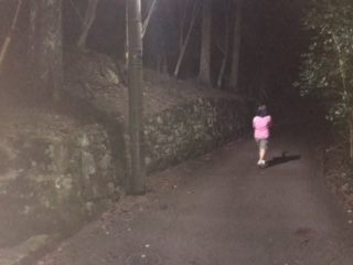 恐怖の肝だめし大会です。初めに先生から約束事や怖いお話を聞き、そのあと、ロウソクの明かりを頼りに真っ暗な中にある神社まで向かいます。そこで課題を解き、戻ってきます。恐る恐る前に進みます。