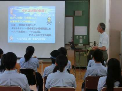 9月9日(金)後期ブロックの8・9年生を対象にした防煙教室を実施しました。NPO法人京都禁煙推進研究会のお医者さん,左京区保健センターの保健師さん,京都市教育委員会指導主事の皆様にお越しいただき,たばこの害や,日本と海外では,たばこの宣伝の仕方が違うことなどについてお話しいただきました。海外ではたばこの宣伝に関しては日本以上に,たばこの害をはっきりと伝えるようです。
