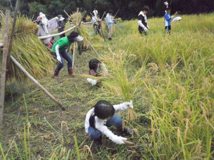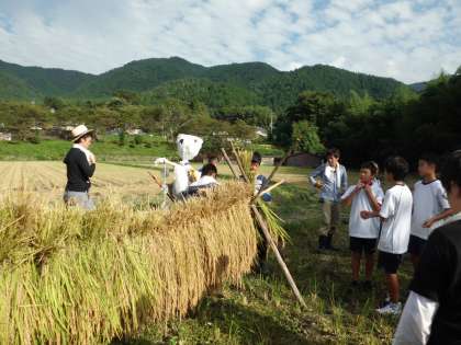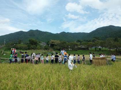 子どもたちはかまを使って稲を刈り取り、ひもで結んで、稲木にかける作業を一生懸命に取り組んでいました。たくさん刈り取れたので、稗(ひえ)を取り除くのが大変そうでした。