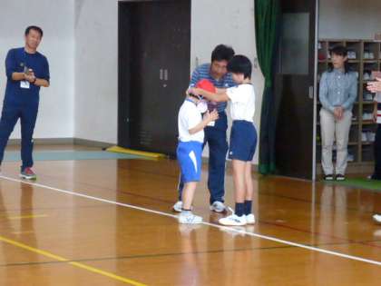 「ハッケ・ヨーイドン」では,児童が一人でお相撲さんを倒すというレースですが,なかなか一人では倒せませんので,1年生から4年生が助っ人に入り,一緒に力を合わせて倒しました。どの子どもも一生懸命に力を出していました。