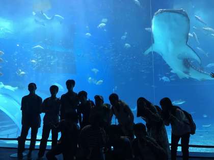 美ら海水族館に入りました。入ったところでは海辺の生物をじかに触れるところがあります。奥へ進むと大きなジンベイザメが泳いでいる巨大な水槽があります。さらに進むと、サメのあごの骨が。みんなで記念撮影を撮りました。