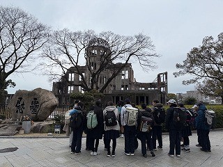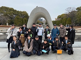 原爆ドーム、平和記念公園を見学し、「祈りの泉」の前で記念写真を撮りました。