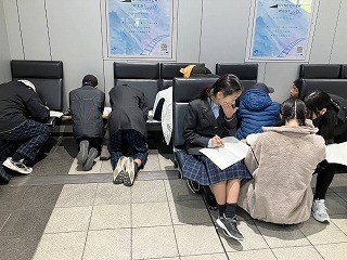 新幹線の時間までベンチスペースで休憩ですが、みんな、椅子を机代わりに、2日間の学習のまとめをしおりに書き込んでいます。